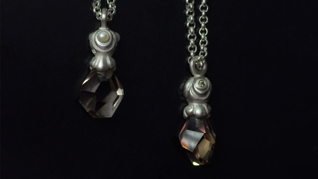 Silber mit Rauchquarzkristallen und Perlen oder Champagner Brillanten.